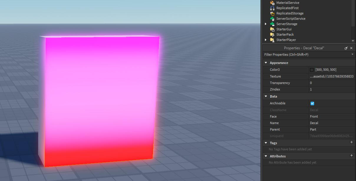Any object that usually has RGB in it can have an increased value above 255, which causes the effect to increase the brightness of a colored object such as decals.An image here shows a good example of the property value above 255 applied to a decal. If any of the RGB values is different, it can result in a differently colored neon effect.